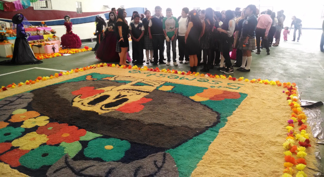 Proyecto de elaboración de tapetes, alusivos a la celebración de Día de Muertos, par6tyicipan todos los grados y niveles